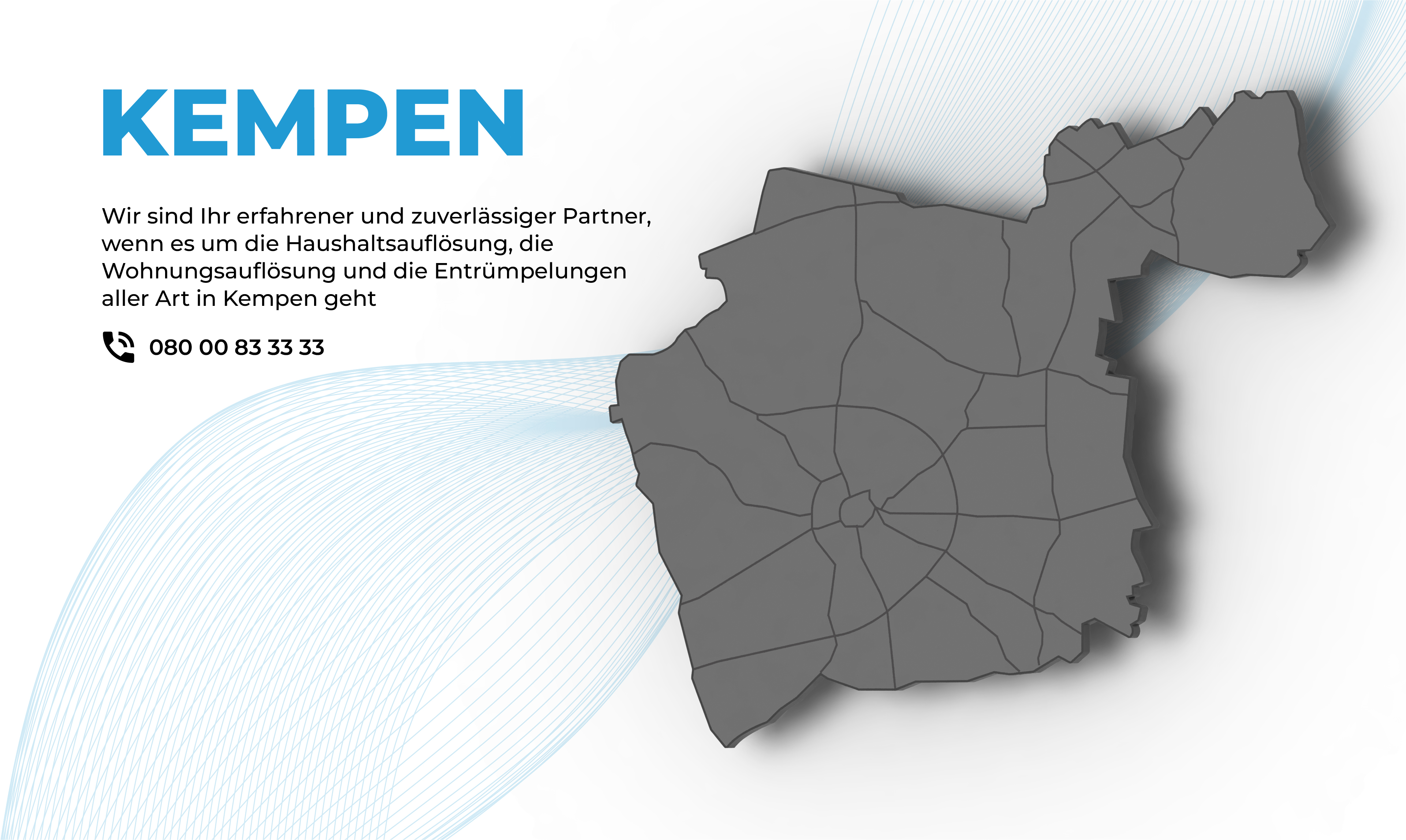 Rhein-Haushaltsauflösung unterstützt Sie professionell bei allen Arbeiten rund um Entrümpelung, Firmenauflösung und Haushaltsauflösung mit Wertanrechnung in Kempen und Umgebung. Unsere Philosophie ist es, jeden Auftrag für Firmen oder Privathaushalte schnell und mit einem unverbindlichen Besichtigungstermin und einem Angebot zum festen Preis zur Ihrer Zufriedenheit auszuführen.