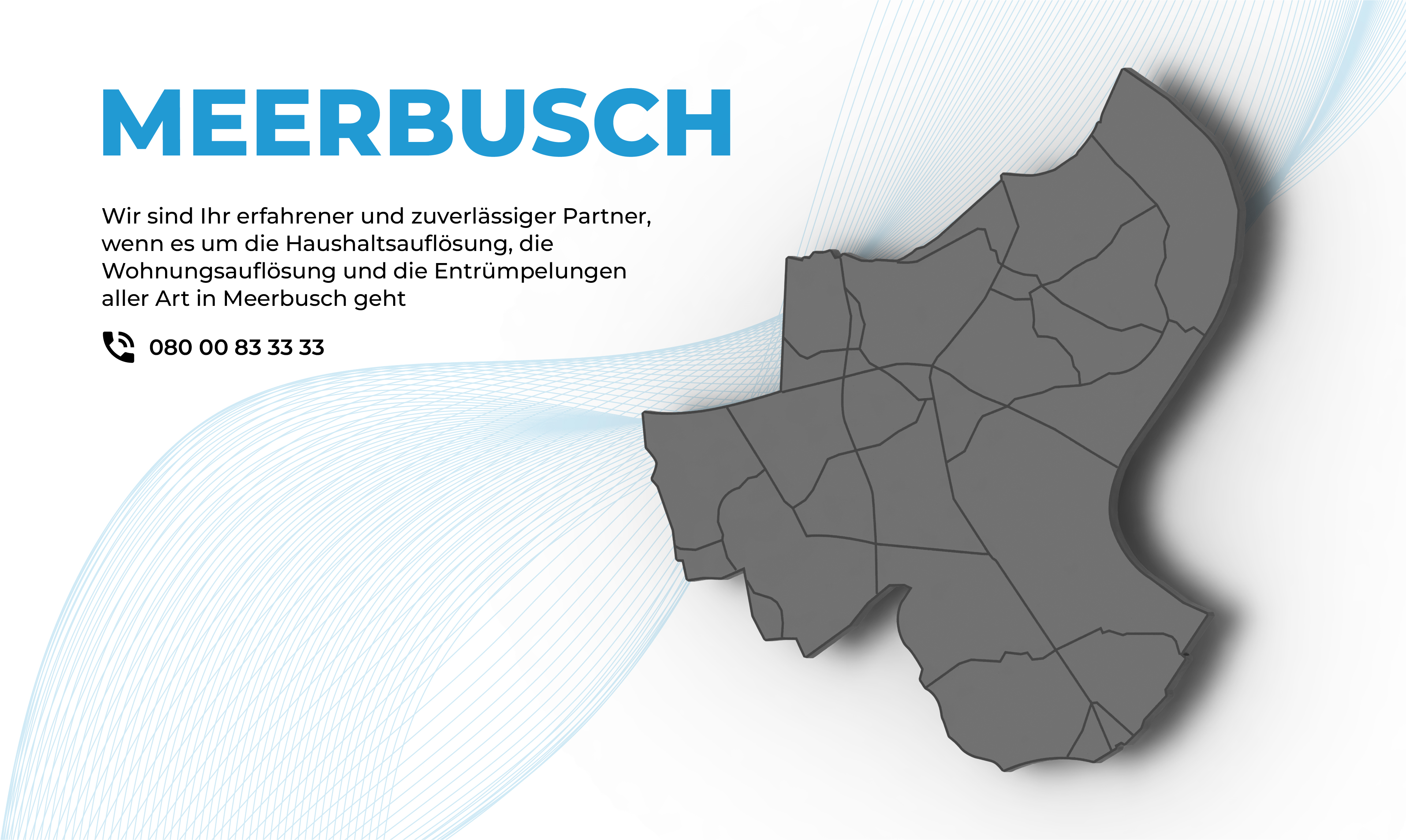 Rhein-Haushaltsauflösung unterstützt Sie professionell bei allen Arbeiten rund um Entrümpelung, Firmenauflösung und Haushaltsauflösung mit Wertanrechnung in Meerbusch und Umgebung. Unsere Philosophie ist es, jeden Auftrag für Firmen oder Privathaushalte schnell und mit einem unverbindlichen Besichtigungstermin und einem Angebot zum festen Preis zur Ihrer Zufriedenheit auszuführen.