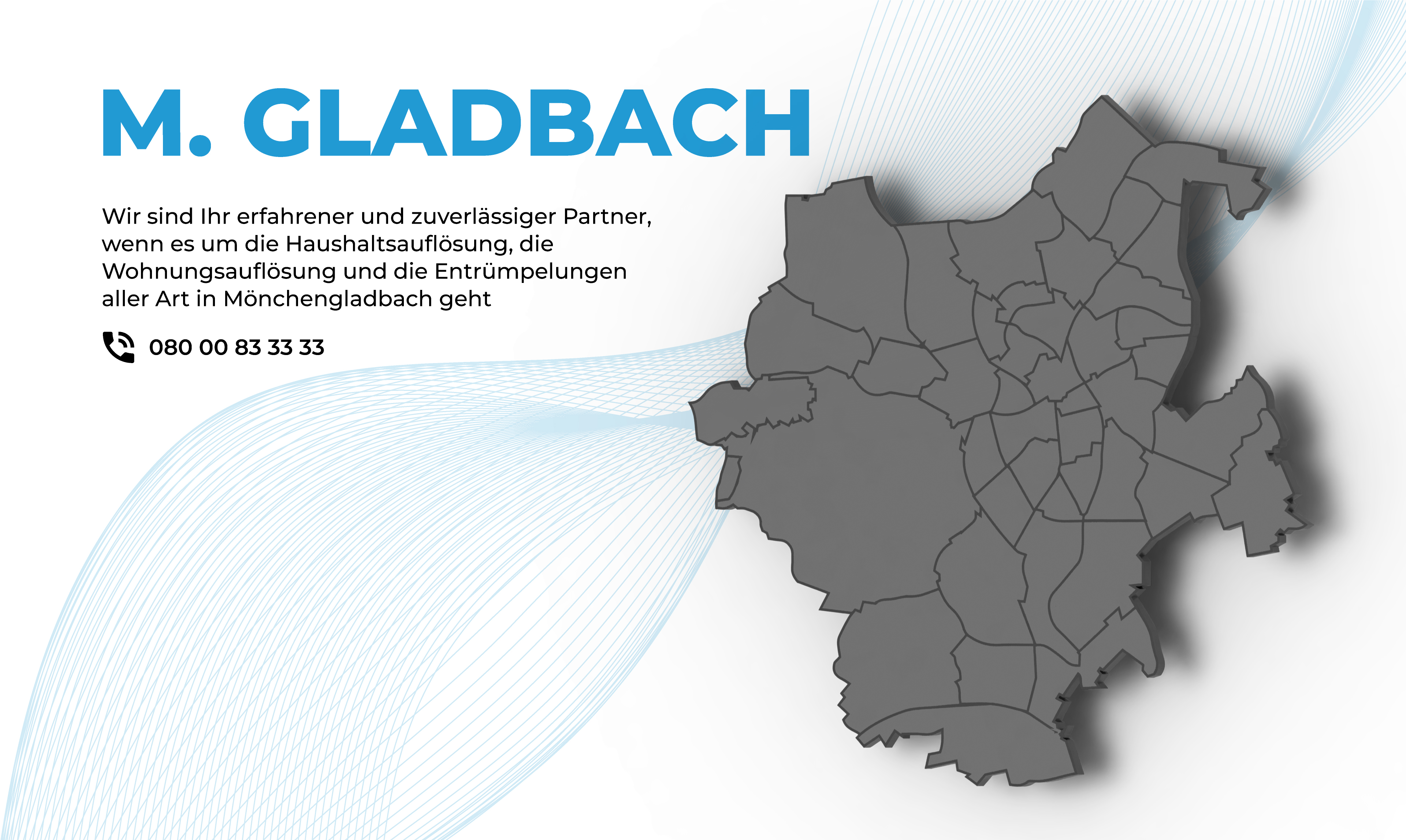 Rhein-Haushaltsauflösung unterstützt Sie professionell bei allen Arbeiten rund um Entrümpelung, Firmenauflösung und Haushaltsauflösung mit Wertanrechnung in Mönchengladbach und Umgebung. Unsere Philosophie ist es, jeden Auftrag für Firmen oder Privathaushalte schnell und mit einem unverbindlichen Besichtigungstermin und einem Angebot zum festen Preis zur Ihrer Zufriedenheit auszuführen.
