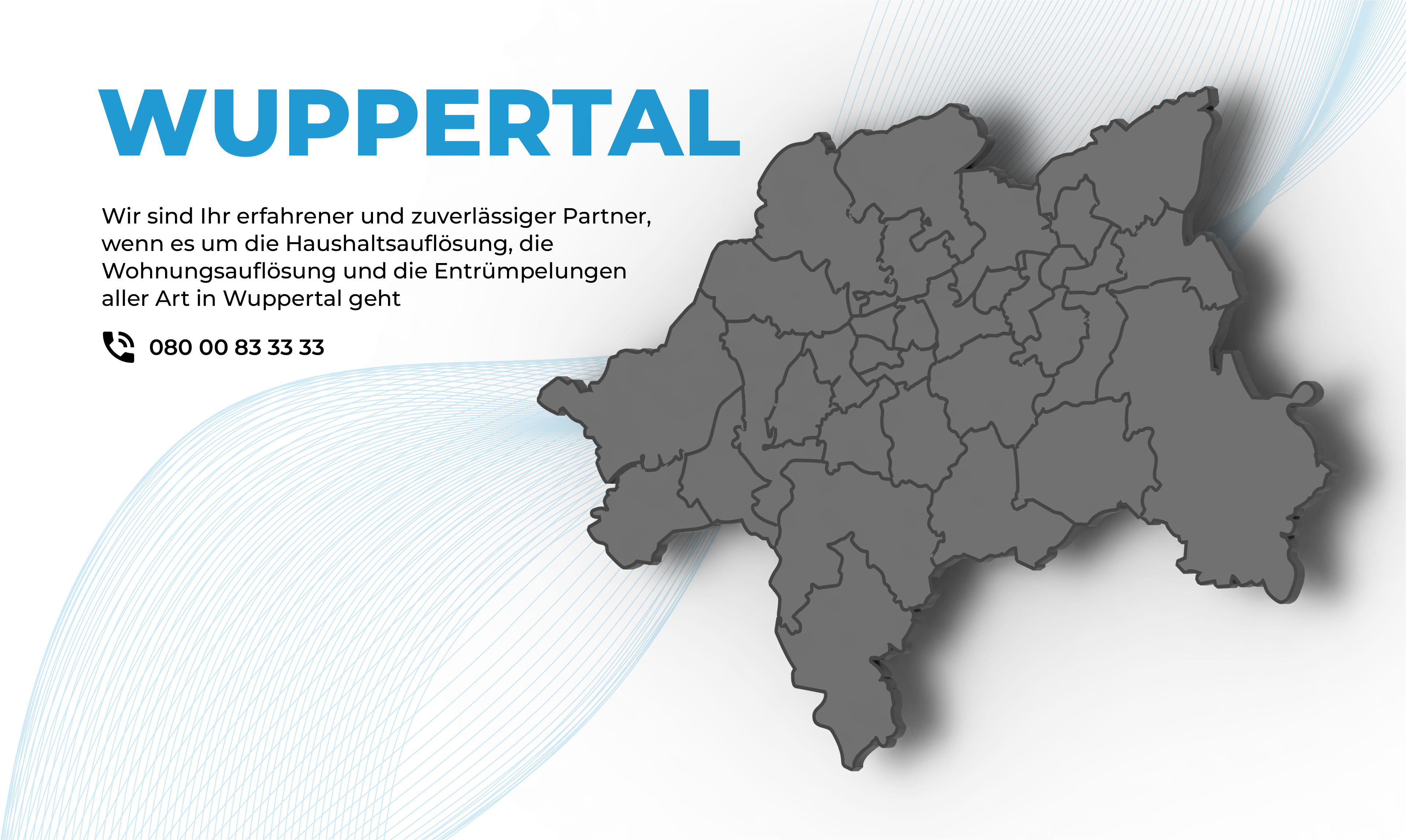 Rhein-Haushaltsauflösung unterstützt Sie professionell bei allen Arbeiten rund um Entrümpelung, Firmenauflösung und Haushaltsauflösung mit Wertanrechnung in Wuppertal und Umgebung. Unsere Philosophie ist es, jeden Auftrag für Firmen oder Privathaushalte schnell und mit einem unverbindlichen Besichtigungstermin und einem Angebot zum festen Preis zur Ihrer Zufriedenheit auszuführen.