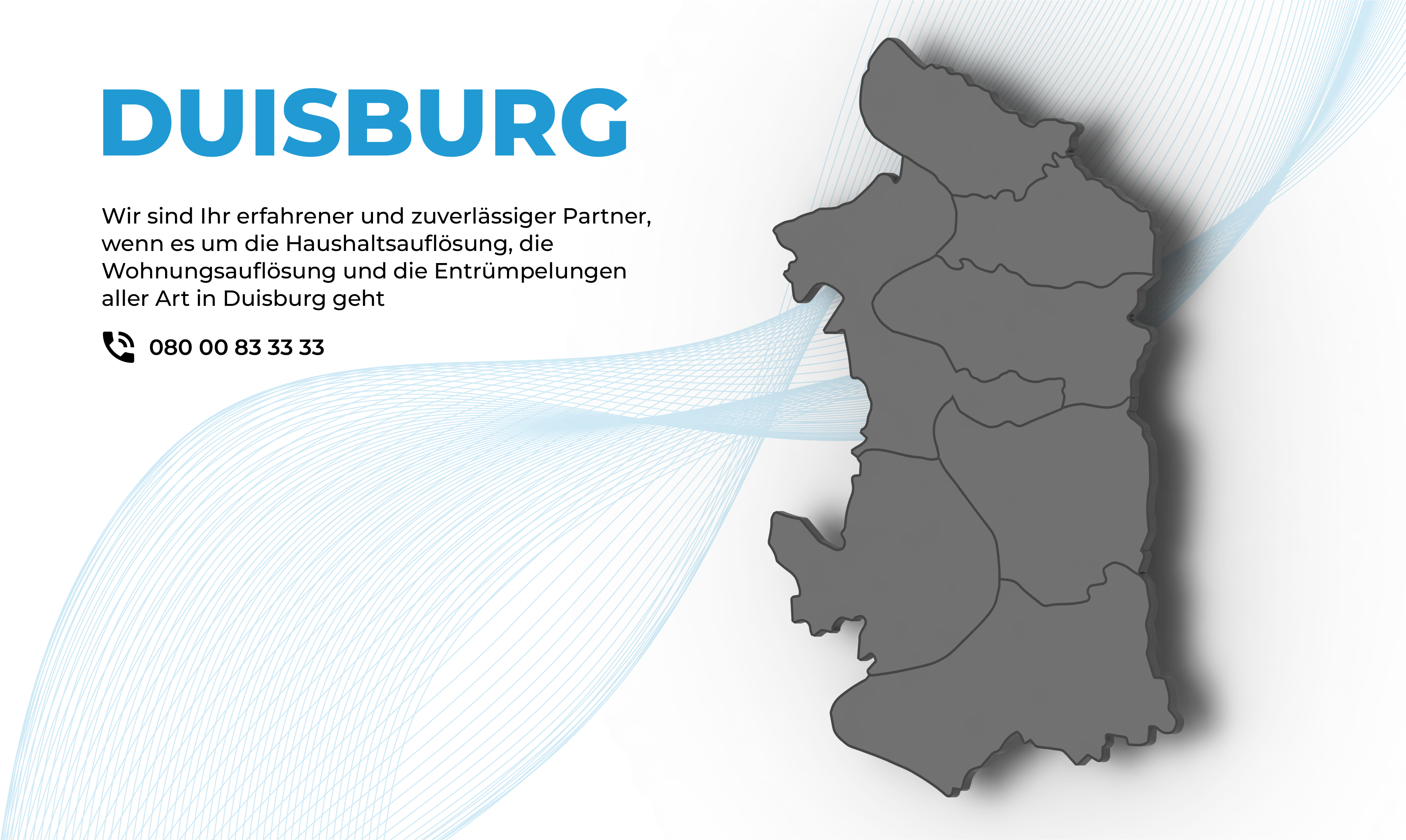 Rhein-Haushaltsauflösung unterstützt Sie professionell bei allen Arbeiten rund um Entrümpelung, Firmenauflösung und Haushaltsauflösung mit Wertanrechnung in Duisburg und Umgebung. Unsere Philosophie ist es, jeden Auftrag für Firmen oder Privathaushalte schnell und mit einem unverbindlichen Besichtigungstermin und einem Angebot zum festen Preis zur Ihrer Zufriedenheit auszuführen.