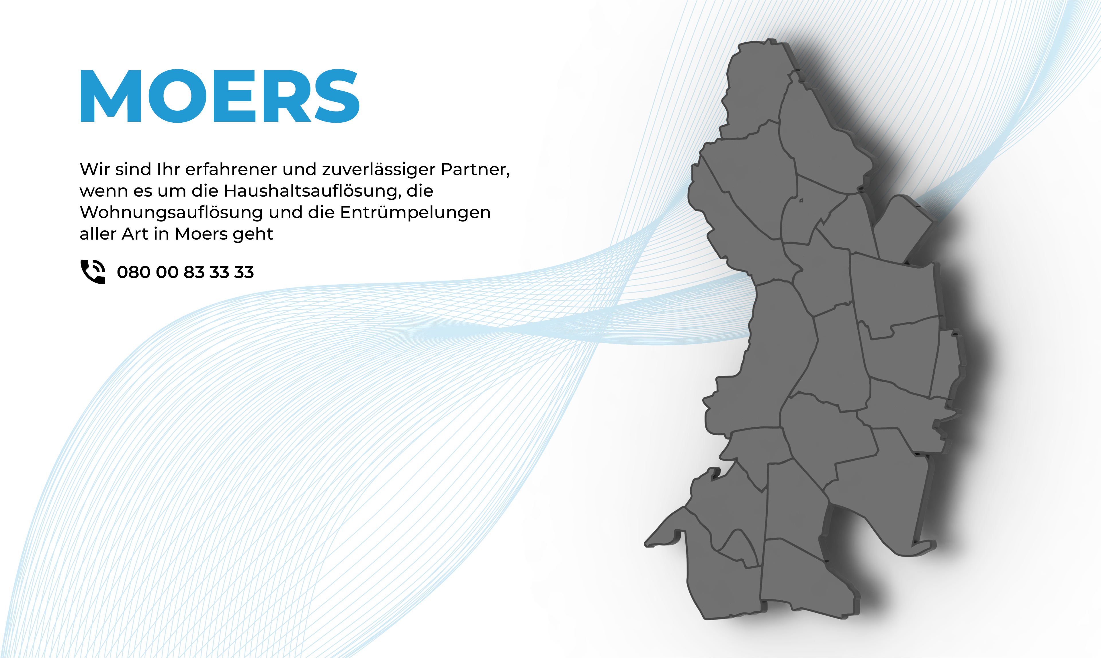 Rhein-Haushaltsauflösung unterstützt Sie professionell bei allen Arbeiten rund um Entrümpelung, Firmenauflösung und Haushaltsauflösung mit Wertanrechnung in Moers und Umgebung. Unsere Philosophie ist es, jeden Auftrag für Firmen oder Privathaushalte schnell und mit einem unverbindlichen Besichtigungstermin und einem Angebot zum festen Preis zur Ihrer Zufriedenheit auszuführen.