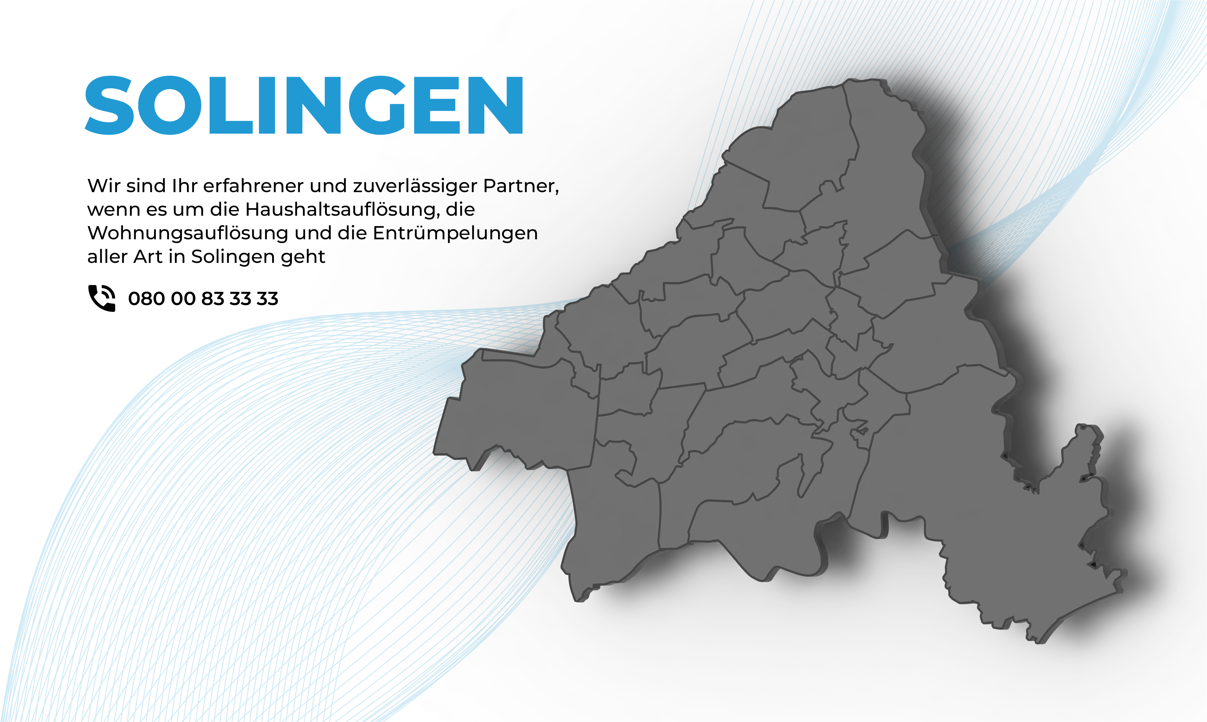 Rhein-Haushaltsauflösung unterstützt Sie professionell bei allen Arbeiten rund um Entrümpelung, Firmenauflösung und Haushaltsauflösung mit Wertanrechnung in Solingen und Umgebung. Unsere Philosophie ist es, jeden Auftrag für Firmen oder Privathaushalte schnell und mit einem unverbindlichen Besichtigungstermin und einem Angebot zum festen Preis zur Ihrer Zufriedenheit auszuführen.
